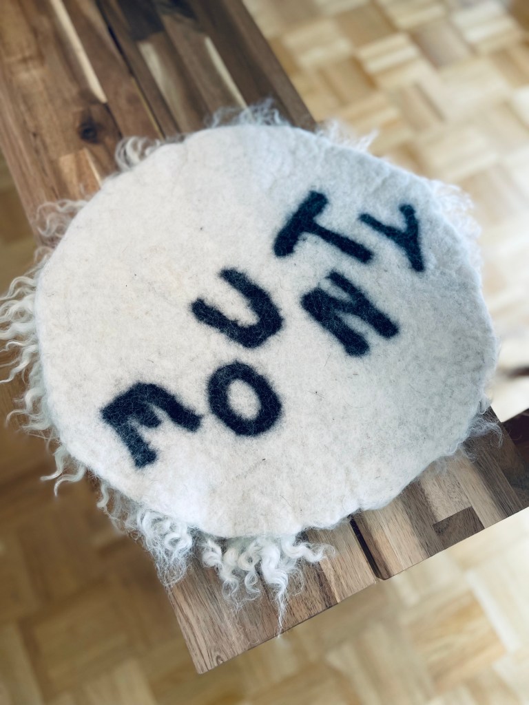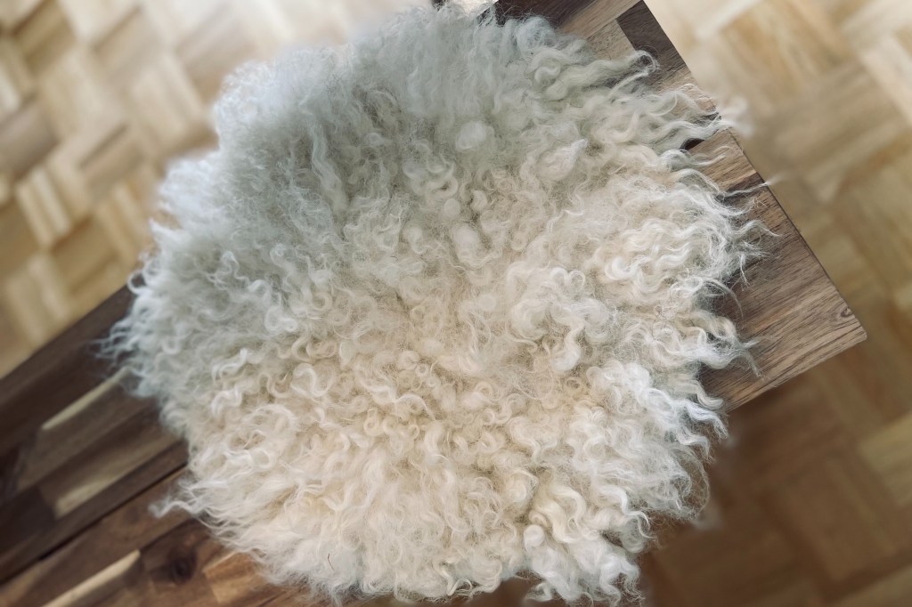 Rundes Sitzkissen aus 100% Walliser-Schwarznasen Schurwolle von unserer „Mounty“.